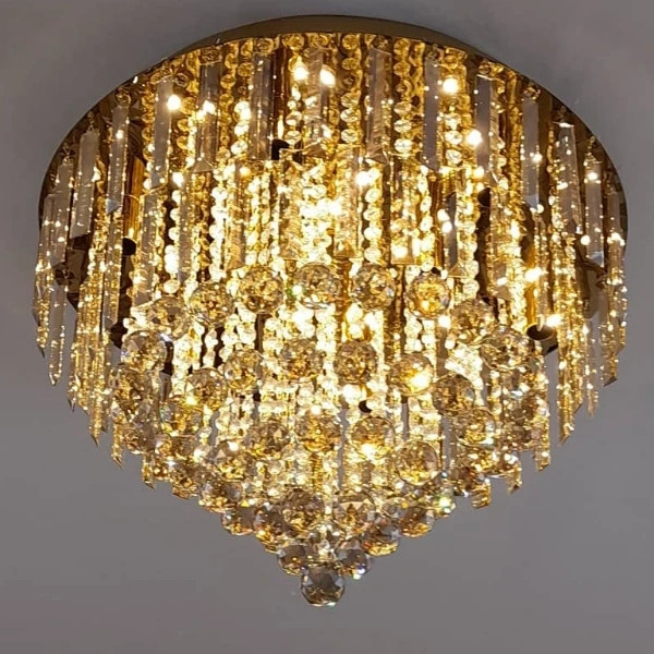 - پایه سقفی استیل براق: صفحه گرد و براق لوستر که به سقف متصل میشود (از جنس استیل)، با آبکاری طلایی (که در تصویر دیده میشود)، نه تنها استحکام و دوام لوستر را تضمین میکند، بلکه با انعکاس نور از کریستالها و لامپها، به درخشش و جلوه کلی لوستر میافزاید و هارمونی کاملی با کریستالهای گرم ایجاد میکند.