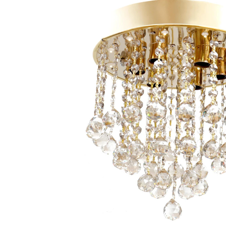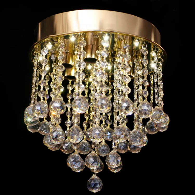 - پایه استیل براق و منعکسکننده: صفحه گرد سقفی از جنس استیل براق (طلایی در تصویر)، به لوستر جلوهای سلطنتی و فاخر میبخشد. این پایه نه تنها نگهدارنده اصلی کریستالهاست، بلکه با انعکاس نور از کریستالها و لامپها، به درخشش و جلوه کلی لوستر میافزاید و هارمونی کاملی با کریستالهای شفاف ایجاد میکند.
