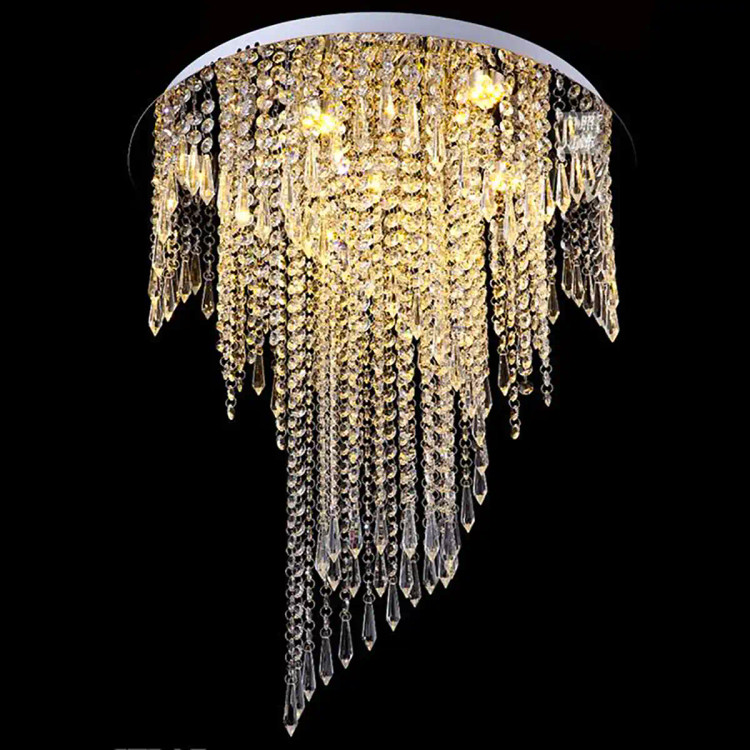 این لوستر سقفی کریستالی با طراحی خاص و آبشاری، برای سقفهای بلند در فضاهای پذیرایی، لابیها و اتاقهای نشیمن بزرگ بسیار مناسب است. آویزهای کریستالی آن با نظم و زیبایی خاصی چیده شدهاند که یک آبشار درخشان از نور و کریستال را ایجاد میکنند.