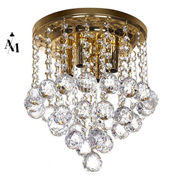 طراحی منحصر به فرد: ترکیب پایهی طلایی براق و گویهای کریستالی، جلوهای شیک و لوکس به این لوستر میبخشد.