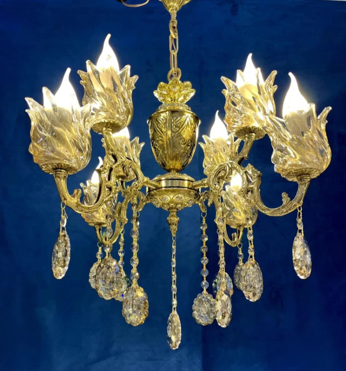 لوستر تمام برنز 4 شاخه 8 شعله با کریستال و لاله درجه یک وارداتی